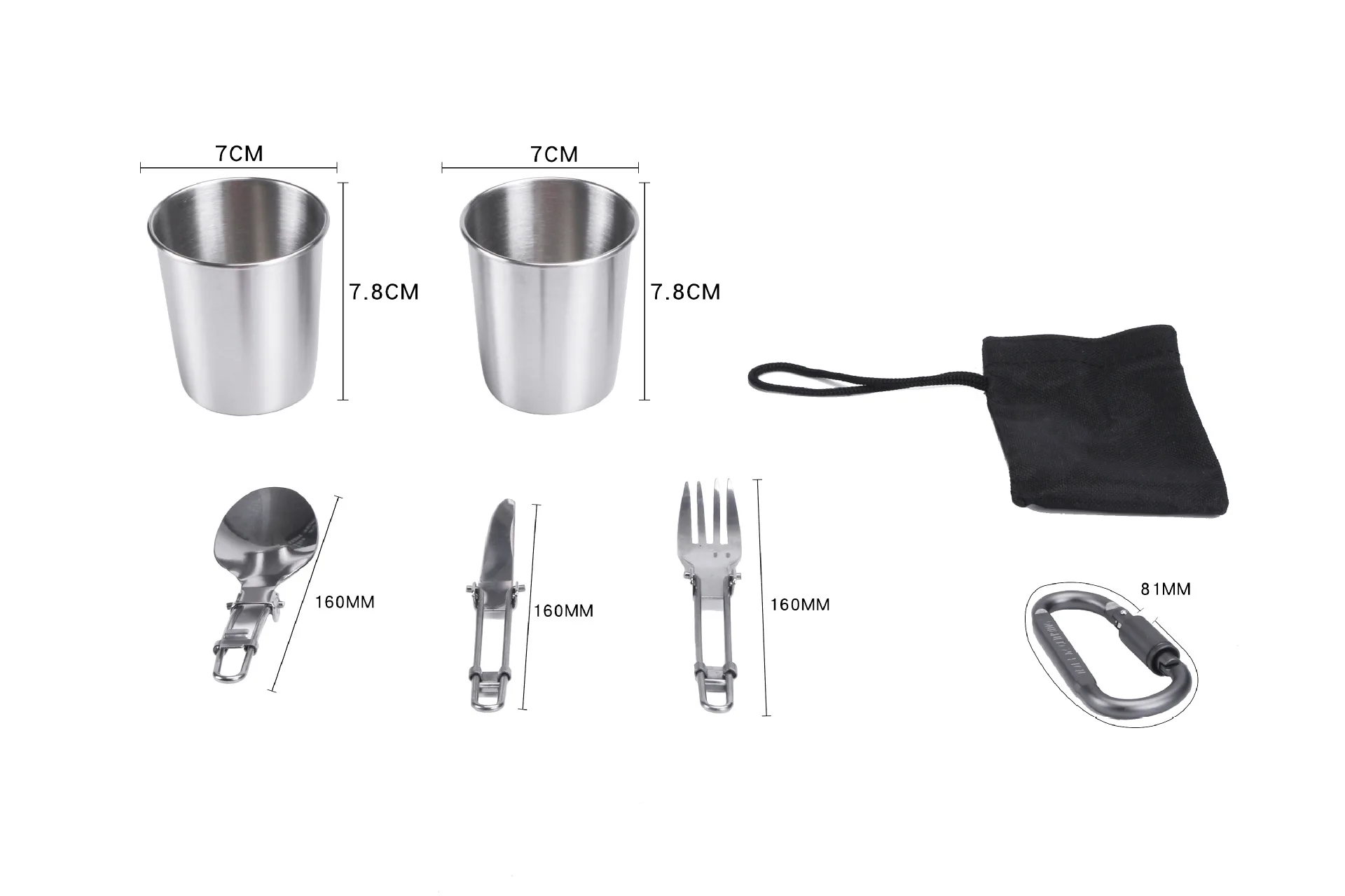 Suitable for 2-3 people, including a large pot, frying pan, a teapot, two stainless steel cups, a fork, a spoonful, a table knife, and a lock. The set of pots is made of aluminum alloy, which has undergone advanced hard treatment and is resistant to high temperature and friction. The knife, fork and spoon are made of 410 stainless steel. Selected 304 stainless steel water cup, specially customized, can be placed close to the teapot for easy portability.